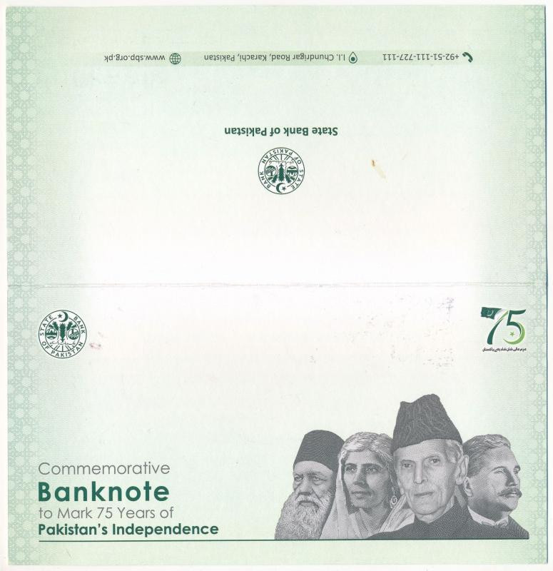 Pakisztán 2022(DN) 75R "A függetlenség 75. évfordulója" "0000000" sorszámú mintabankjegy "SPECIMEN (minta)" perforációval, papír dísztokban T:UNC