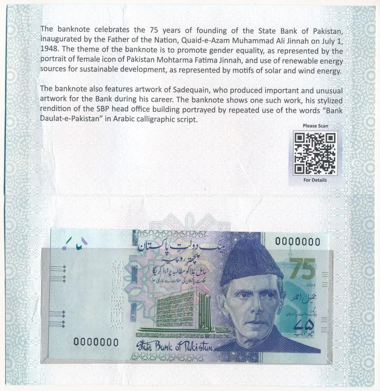 Pakistan 2023. 75 Rupees "75th anniversary of State Bank of Pakistan" with "0000000" serial number, with "SPECIMEN" perforation in a slightly damaged paper case C:AU