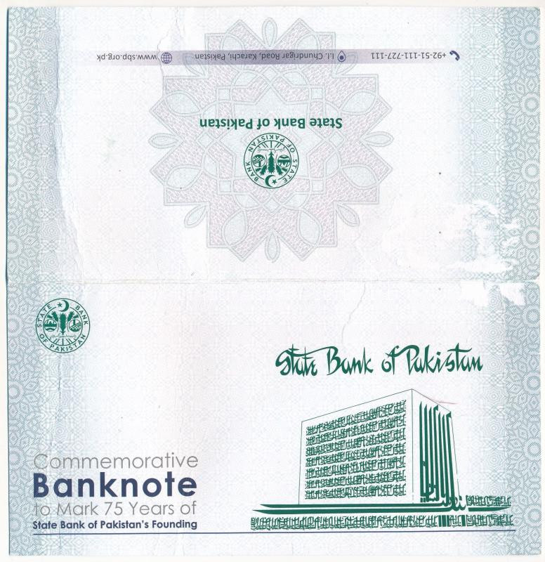 Pakisztán 2023. 75R "A Pakisztáni Állami Bank 75. évfordulója" "0000000" sorszámú mintabankjegy "SPECIMEN (minta)" perforációval, kissé sérült papír dísztokban T:AU