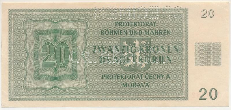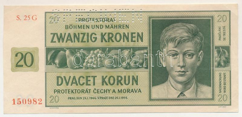 Német Harmadik Birodalom / Cseh-Morva Protektorátus 1944. 20K "25 G 150982", "SPECIMEN (MINTA)" perforációval T:XF hajtatlan, de nagyobb sarokhajlások