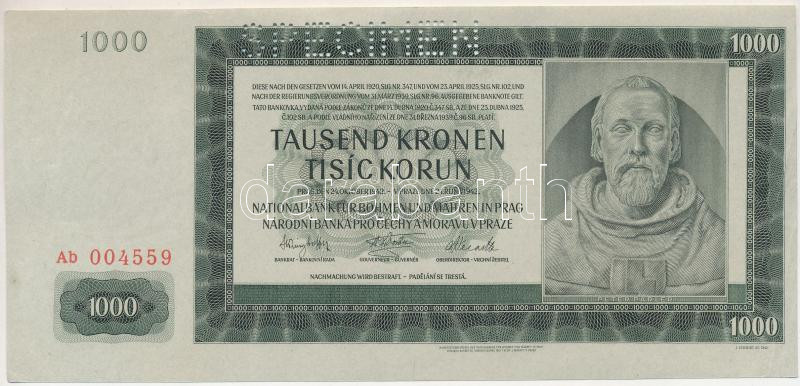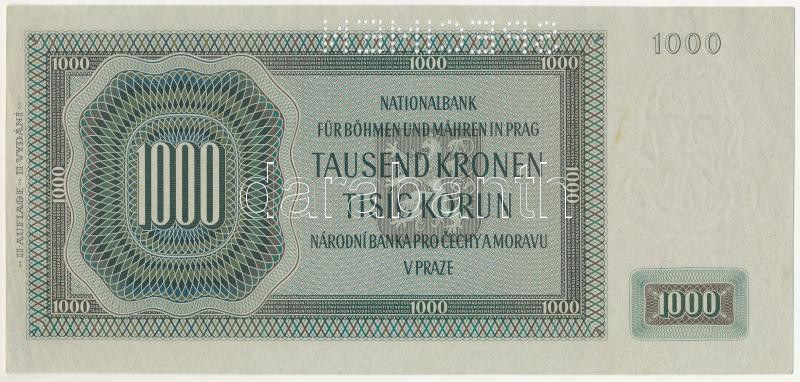 Német Harmadik Birodalom / Cseh-Morva Protektorátus 1942. 1000K "Ab 004559", "SPECIMEN (MINTA)" perforációval, 2. kiadás T:XF hajtatlan, de a jobb alsó sarokban több German Third Reich / Protectorate of Bohemia and Moravia 1942. 1000 Korun "Ab 004559" with "SPECIMEN" perforation, 2nd issue C:XF unfolded, but multiple corner folds at the lower right corner
