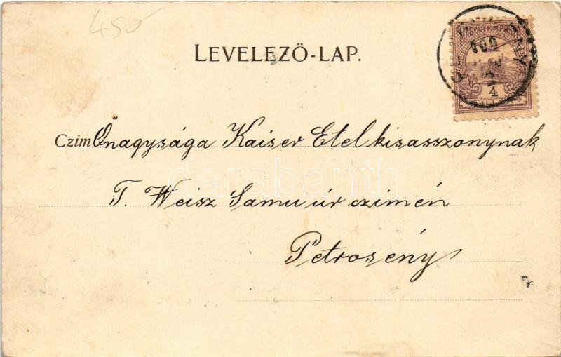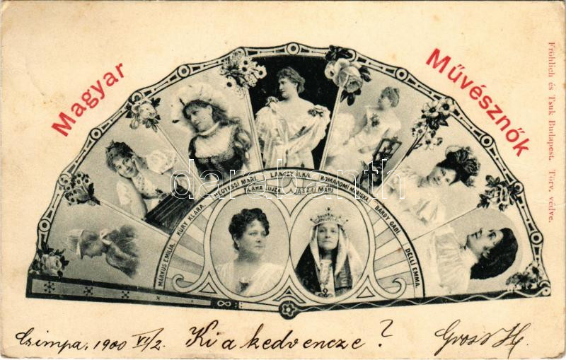 1900 Magyar művésznők, színésznők legyezőn: Blaha Lujza, Jászai Mari, Márkus Emília, Küry Klára, Hegyessi Mari, Lánczy Ilka, Komáromi Mariska, Bárdy Gabi, Delli Emma. Fröhlich és társuk kiadása / Hungarian actresses. Art Nouveau, floral (fl)