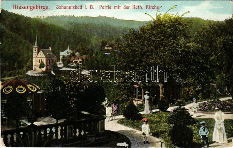 Janské Lázne, Johannisbad (Krkonose, Riesengebirge); Partie mit der kath. Kirche / view with the Catholic church (worn corners)