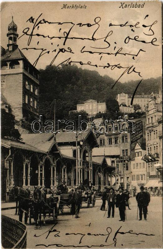 1913 Karlovy Vary, Karlsbad; Marktplatz / market square, bank and exchange office, shop of Franz Reis (EK)