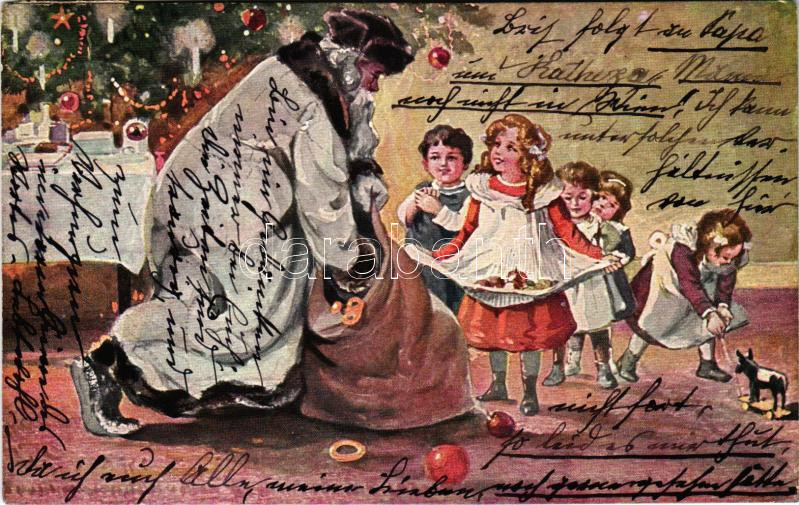 1910 Üdvözlet a Mikulástól / Christmas greeting art postcard with Saint Nicholas and children. photo