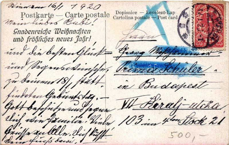 1920 Gnadenreiche Weihnachten und fröhliches neues Jahr! / Karácsonyi üdvözlet Mikulással / Christmas and New Year greeting art postcard with Saint Nicholas, children and toys. G.O.T. (EK)