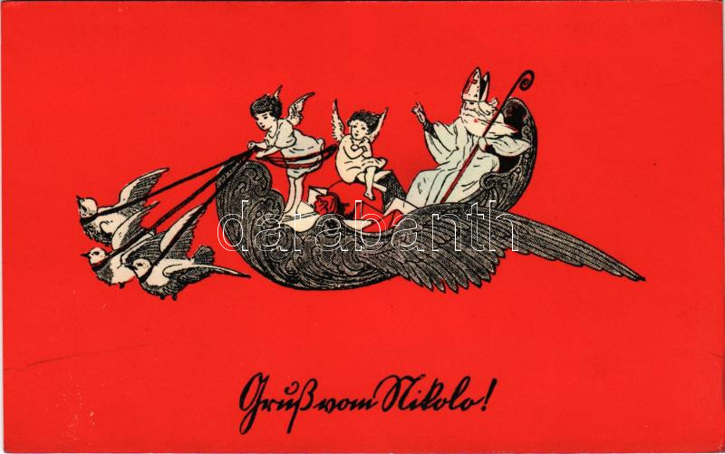 1927 Gruss vom Nikolo / Üdvözlet a Mikulástól / Christmas greeting art postcard with Saint Nicholas and chariot pulled by doves. C. H. W. VIII/2. 2502-36. (EK)