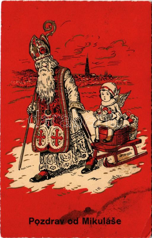 Üdvözlet a Mikulástól / Saint Nicholas greeting art postcard. litho
