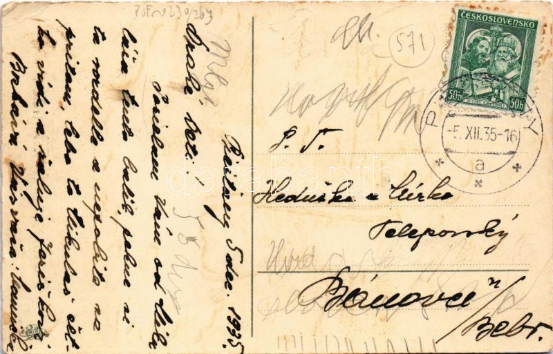 1935 Pozdrav od Mikuláse / Saint Nicholas with angel on a sled art postcard (EB)
