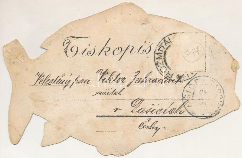 Veselé Vánoce. Tahle mrska roztomilá, vází jiste 102 kila. Náklad. L. Kautsky Praha / cseh nyelvű hal alakú karácsonyi üdvözlőlap / Czech fish-shaped Christmas greeting card. litho (b)