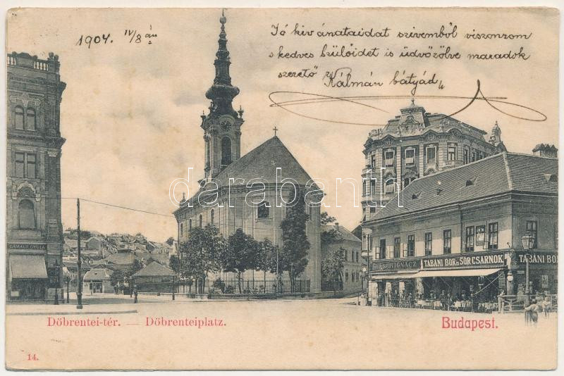1904 Budapest I. Tabán, Döbrentei tér, Keller Ignác Tabáni bor- és sörcsarnoka, Gamauf Gyula üzlete, Szerb ortodox templom (r)