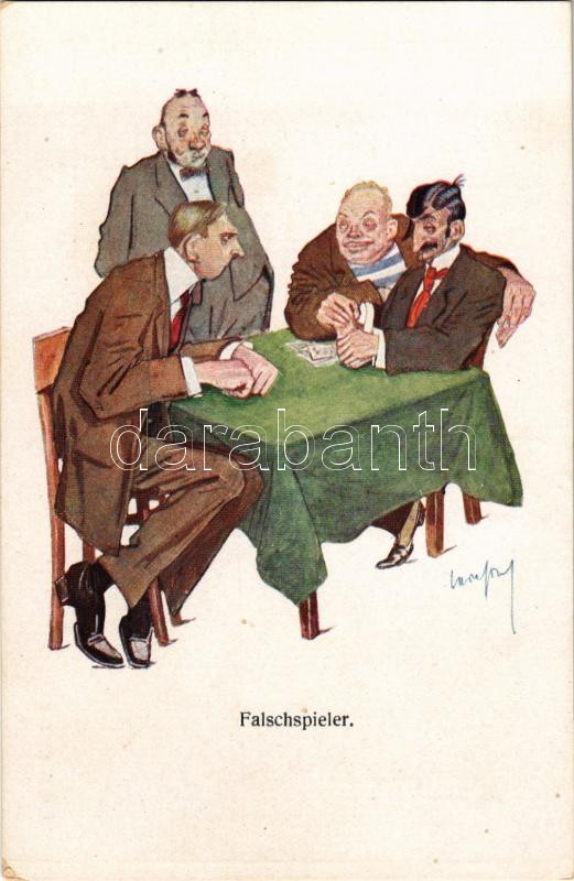 Falschspieler / Gentlemen playing card games, art postcard. B. K. W. I. 234-2. s: Carl Josef (fl)