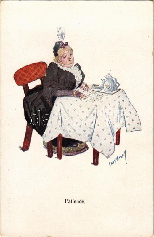 Patience. Lady playing card games, art postcard. B. K. W. I. 234-1. s: Carl Josef (fl)