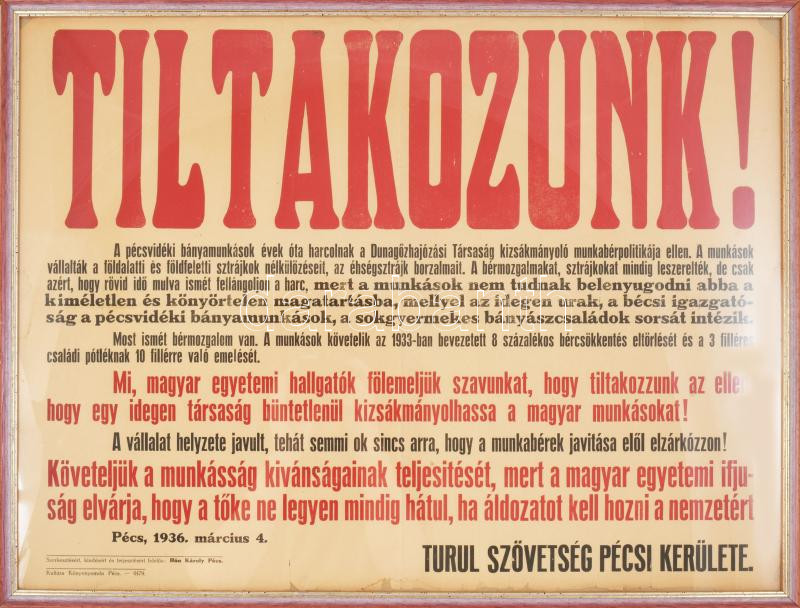 "Tiltakozunk! A pécsvidéki bányamunkások évek óta harcolnak a Dungőzhajózási Társaság kizsákmányoló munkabérpolitikája ellen. ... Mi, magyar egyetemi hallgatók fölemeljük szavunkat, hogy tiltakozzunk az ellen, hogy egy idegen társaság büntetlenül kizsákmányolhassa a magyar munkásokat! A vállalat helyzete javult, tehát semmi ok sincsa ara, hogy a munkabérek javítása elől elzárkózzon!