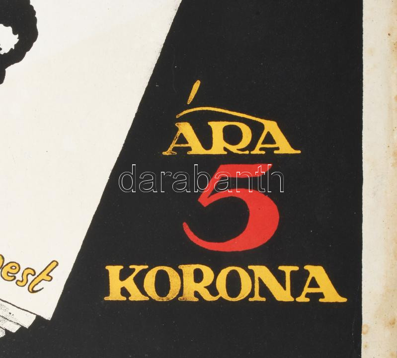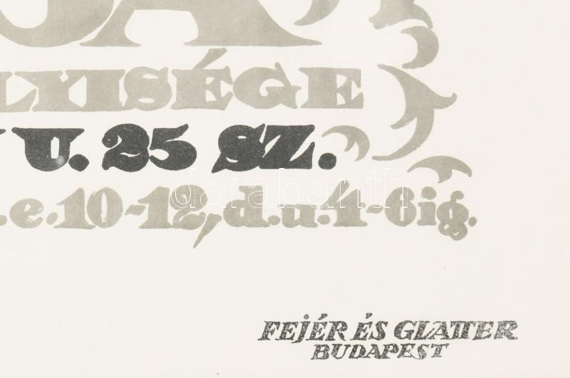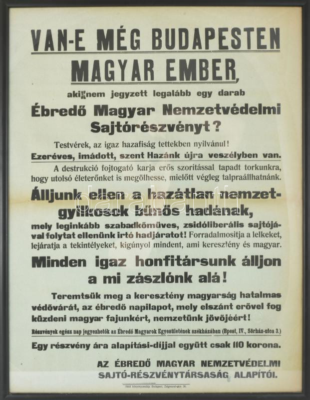 cca 1920-as évek "Van-e még Budapesten magyar ember, aki nem jegyzet legalább egy darab Ébredő Magyar Nemzetvédelmi Sajtórészvényt?... Álljunk ellen a hazátlan nemzetgyilkosok bűnös hadának, mely leginkább szabadkőműves, zsidóliberális sajtóval folytat ellenünk irtó hadjáratot! Minden igaz honfitársunk álljon a mi zászlónk alá! Teremtsük meg a keresztény magyarság hatalmas védővárát, az ébredő napilapot, mely elszánt erővel fog küzdeni magyar fajunkért, nemzetünk jövőjéért! ..." Ébredő Magyarok Egyesülete szélsőjobboldali fajvédő szervezethez szorosan kötődő Ébredő Magyar Nemzetvédelmi Sajtó-Részvénytársaság plakátja, Bp., Held-ny, modern üvegezett keretben, hajtásnyommal, kis sérüléssel, hajtásnyommal, 65x50 cm