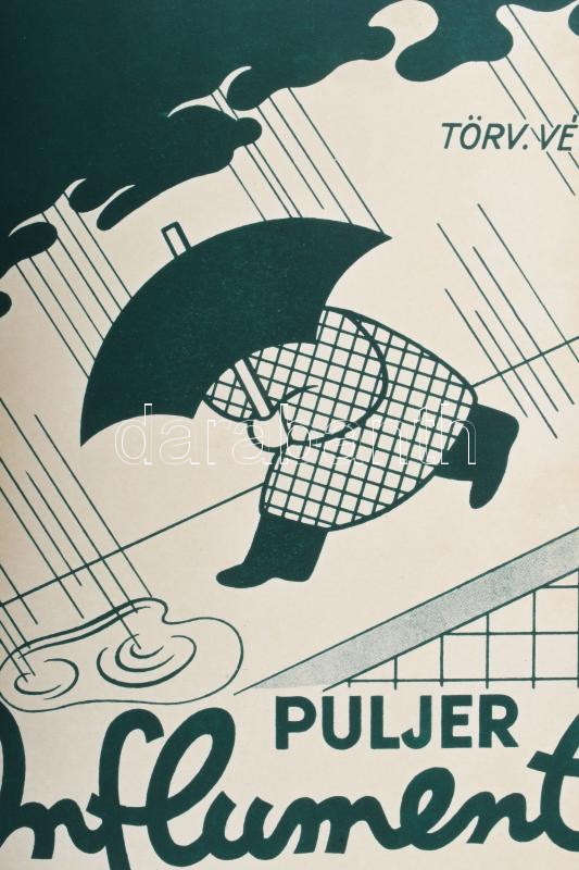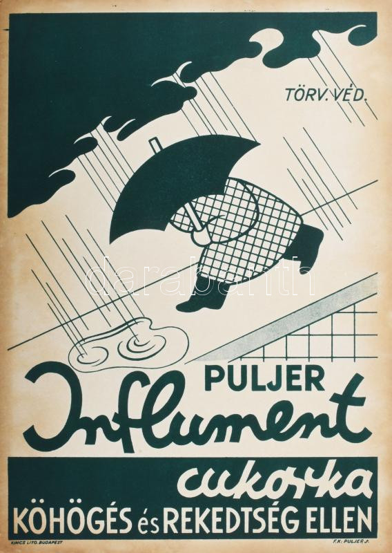 "Puljer Influment cukorka köhögés és rekedtség ellen", art deco plakát, karton, szerepelt egy példány az art deco kiállításon, Bp., Kincso-ny., 34x24 cm