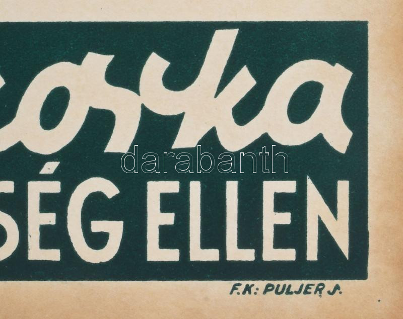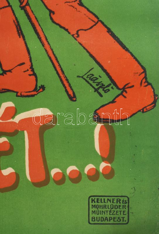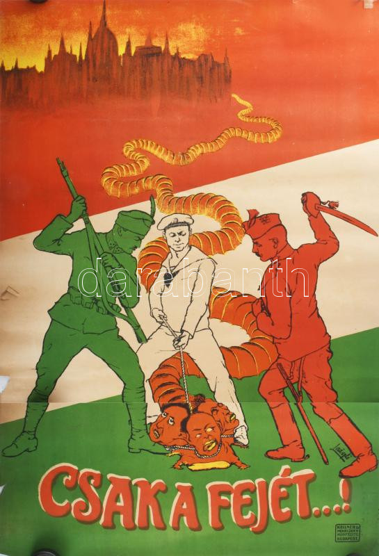 Laászló F. Gyula (-): "Csak a fejét...!" Litográfia, papír, jelzett a plakáton, Kellner és Mohrlüder Műintézete, Bp. Lapszéli kisebb sérülésekkel, feltekerve. 87x60 cm. A kommunista eszmék kiirtását jelképező politikai propaganda-plakát a magyarországi "vörös" rémuralom után 1919 őszén, magyar katonák ábrázolásával, a trikolór színeiben. Ritka!