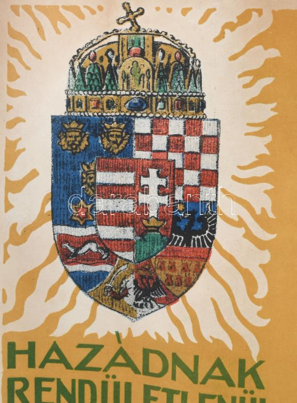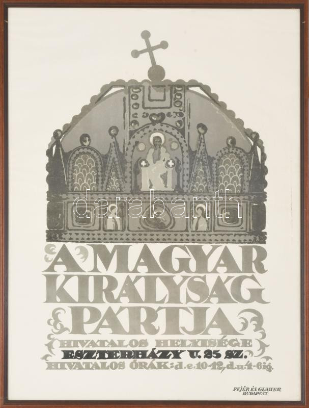 1919 Jeges Ernő (1898-1956): "A Magyar Királyság Pártja Hivatalos Helyisége Eszterházy u. 25. sz. ... ", Bp., , plakát, papír, Fejér és Glatter-ny., gyűrődésekkel, hajtásnyommal, modern üvegezett keretben: 62x46,5 cm, keret: 64x49 cm