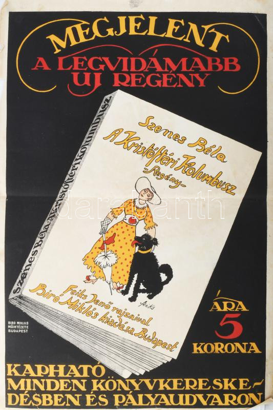 cca 1918 Szenes Béla: A kristóftéri Kolumbusz, regény, Feiks Jenő rajzaival, plakát, litográfia, papír, Biró Miklós Műintézete, Bp., hajtva, lapszéli sérülésekkel, alján vágott, 47x31,5 cm