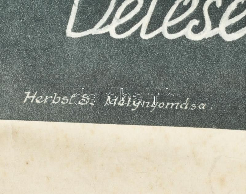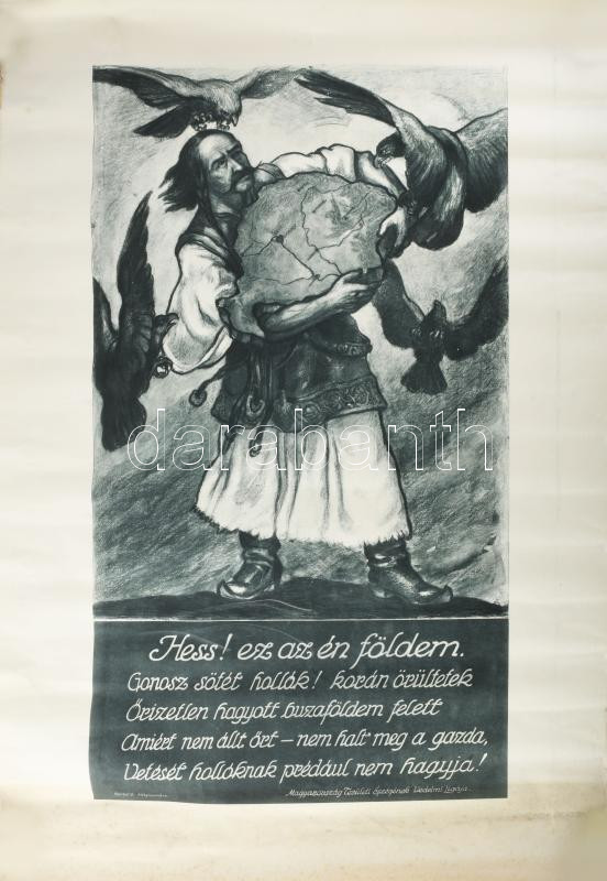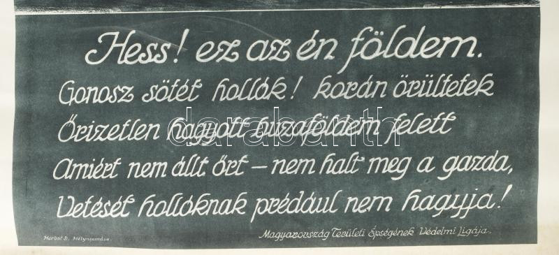 Helbing Aranka (1898-1974): Hess! Ez az én földem. (...). Irredenta propaganda plakát, kiadja Magyarország Területi Épségének Védelmi Ligája, Herbst S. mélynyomása, jelzés nélkül, hajtásnyomokkal, alján kissé foltos, lapszéli apró szakadásokkal, 95×63,5 cm. Ritka!