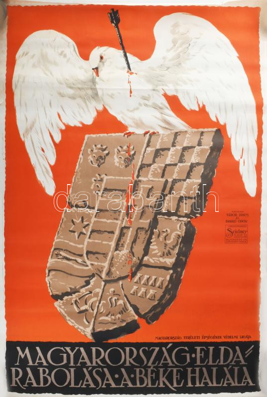 Tábor (Taupert) János (1890-1956), Dankó Ödön (1889-1958): Magyarország eldarabolása a béke halála, irredenta plakát, chromolitográfia, papír, jelzett a plakáton. Seidner, Bp.. 94×63 cm. Hajtásnyomokkal, egészen apró lapszéli foltokkal és lapszéli apró szakadással, máskülönben jó állapotban. Gyűjtői darab! / cca 1920 irredentist poster.