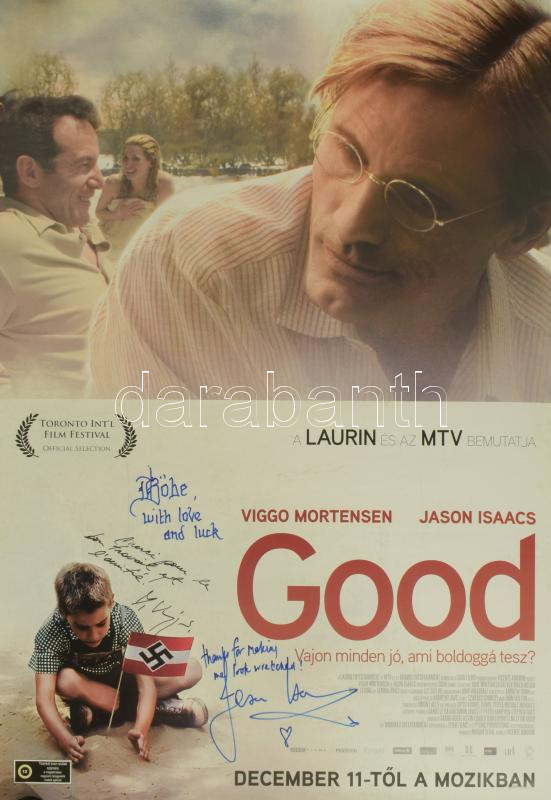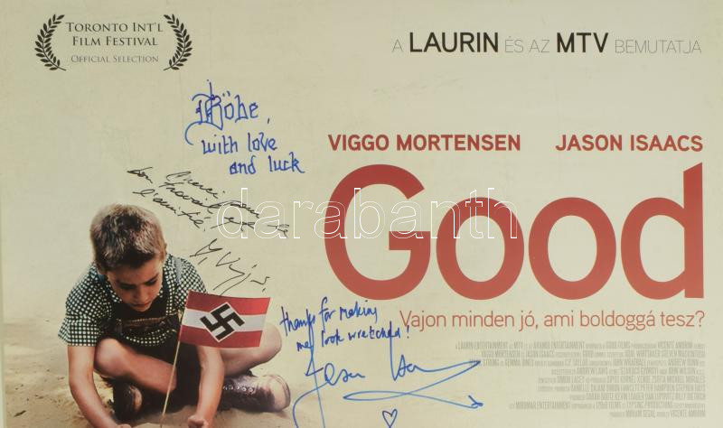 Viggo Mortensen (1958-) Oscar- és Golden Globe-díjra jelölt dán származású amerikai színész, rendező, énekes, zenész, író, költő és festőművész és Jason Isaacs (1963-) angol színész autográf dedikációja a Good c. film plakátján. /