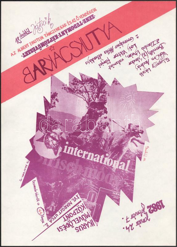 Bernáthy Sándor (1949-2012): Barkácskutya. Az Albert Einstein [Bizottság] Tánczenekar és az ő vendégeik. FeLugossy László, Wahorn András, Bernáth(y) Sándor, efZámbó István valamint Lois Viktor filmjei és Grandpierre Attila előadásai. Zene. Tudomány. Képzőmővészet. 1982. jan. 24 - febr. 7. Ikarus Művelődési Központ, Bp. Underground koncert- és kiállításplakát, ofszet, papír, jelzett a plakáton, 40x28,5 cm.