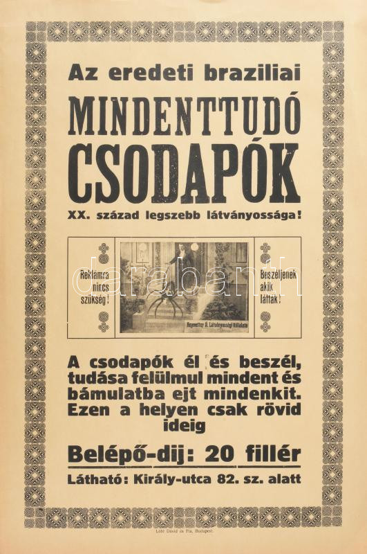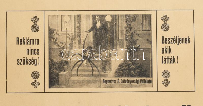 cca 1915 Az eredeti brazíliai mindenttudó csodapók, XX. század legszebb látványossága! Reymetter Á. Látványossági Vállalata, látható: Király-utca 82. sz. alatt. Plakát, papír, jelzés nélkül, Löbl Dávid és Fia. 48x31,5 cm