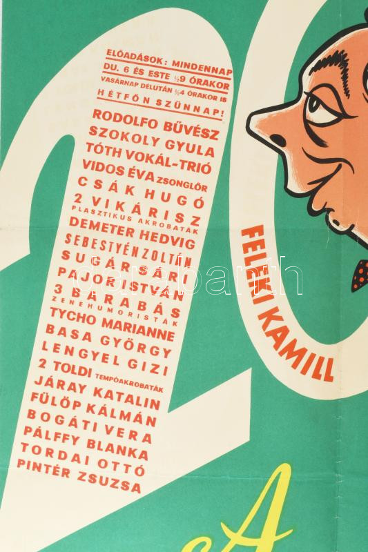cca 1957-1958 Kamara varieté, A fentről jött ember, Feleki Kamill, Salamon Béla, plakát, papír, jelzés nélkül (Vogel Eric v. Kassovitz Félix?), Plakát Címke Nyomda, hajtásnyomokkal, többségében javított szakadásokkal és apró sérülésekkel, 69x48 cm