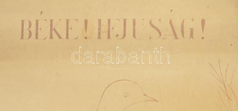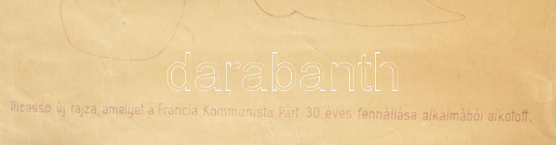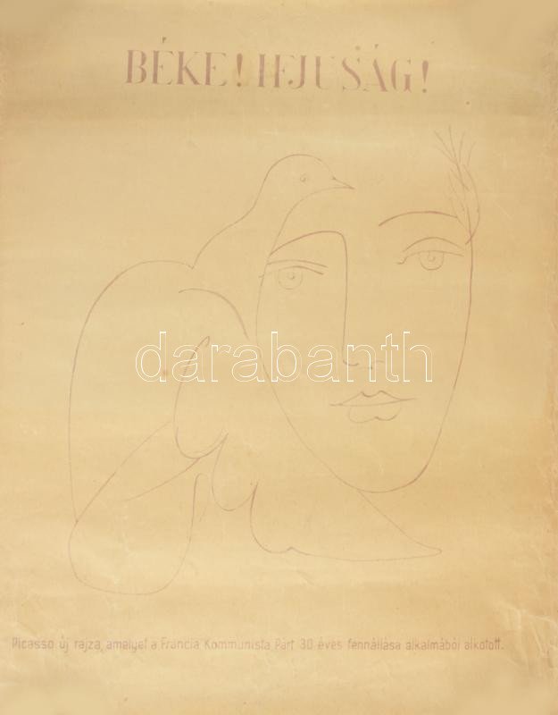 cca 1950 Béke! Ifjúság! Picasso új rajza, amelyet a Francia Kommunista Párt 30 éve fennállása alkalmából alkotott, plakát, papír, jelzés nélkül, hajtásnyomokkal, gyűrődésekkel, apró lapszéli sérüléssel, 52×42 cm