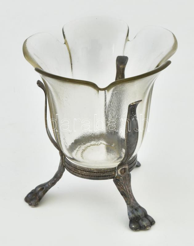 Antik potpourri tartó. Három oroszlánkarmos ezüstözött fém lábon áll, virág alakú üvegbetéttel, jelzés nélkül, m: 14,5 cm