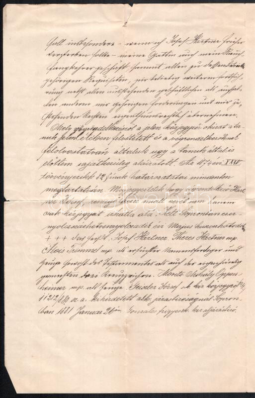 1881 Sopron, közjegyzői okirat, Hartner József kéményseprő 1878-ban kelt végrendeletének másolata, két beírt oldal, hajtva, lapszéli szakadással