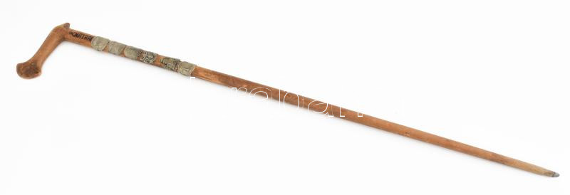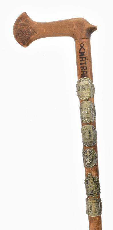Description: cca 1940 Turistabot, 6 darab magyar jelvénnyel: Galya Nagyszálló, Kékes Szálló, Baán Szálló Mátraháza, Zugliget Disznófő, Budapest Jánoshegy, Siófok. H: 92 cm