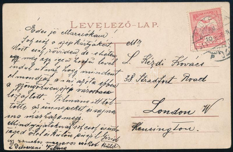 1911 Debreczeni Vilma képeslapja Budapestről Londonba, Kézdi-Kovács Lá...