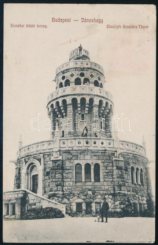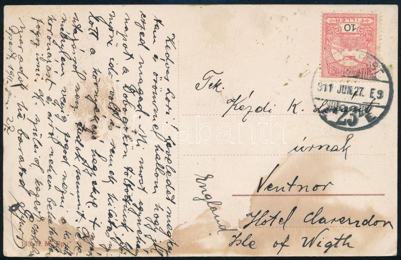 Description: 1911 Kézdi-Kovács Lóránthoz (1897-1916), Kézdi-Kovács László (1864-1942) festőművész, műkritikus fiához írt képeslap, "Kedves Lóri" megszólítással, Budapestről Angliába, Ventnorba, a hátoldalán a János-hegyi Erzsébet kiáltóval, foltos.