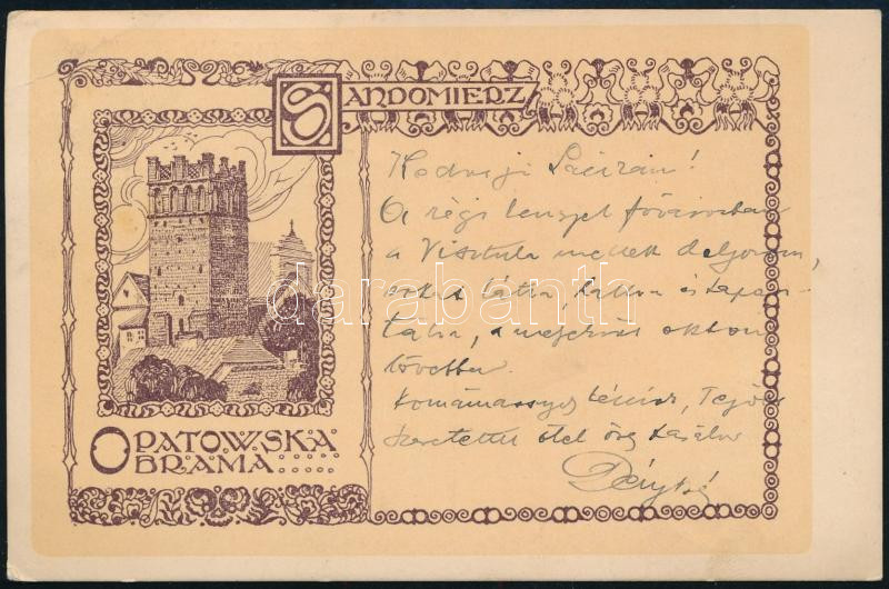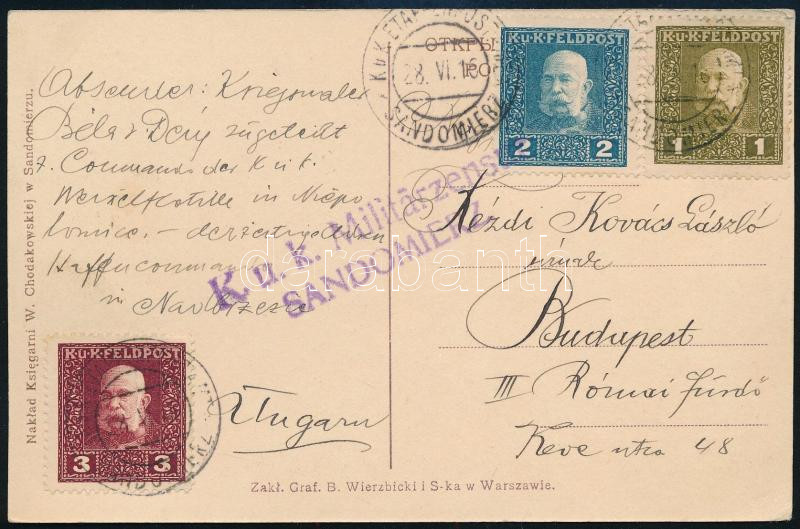 Description: 1916 Déry Béla (1868-1932) festőművész, a Nemzeti Szalon igazgatójának saját kezűleg megírt képeslapja Kézdi-Kovács László (1864-1942) festőművész, műkritikus részére, Sandomierz Budapestre, cenzori bélyegzéssel (K. u. k. Militärzensor Sandomierz.)