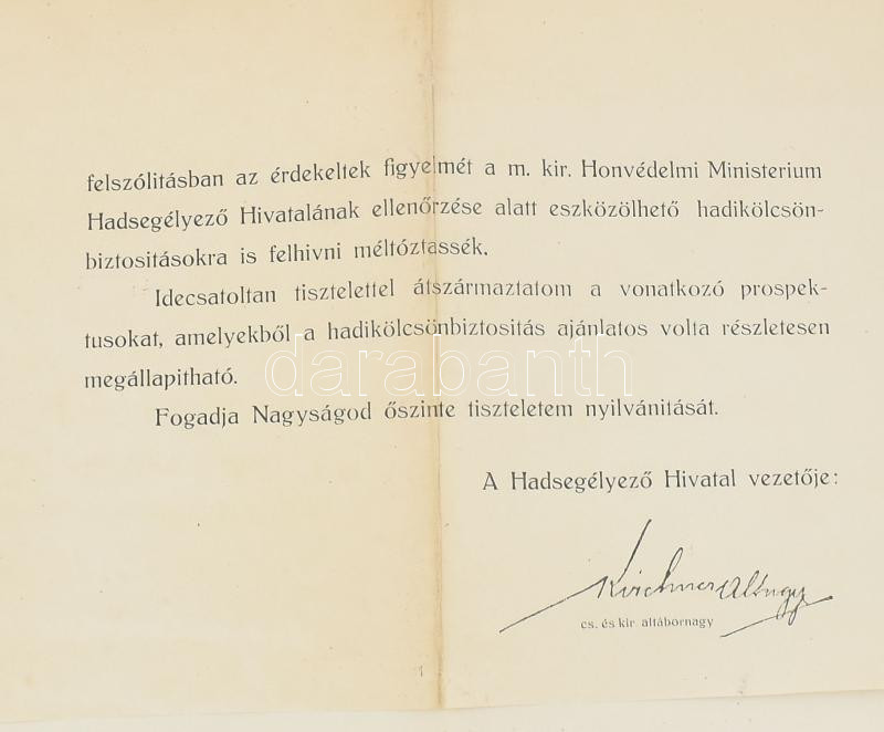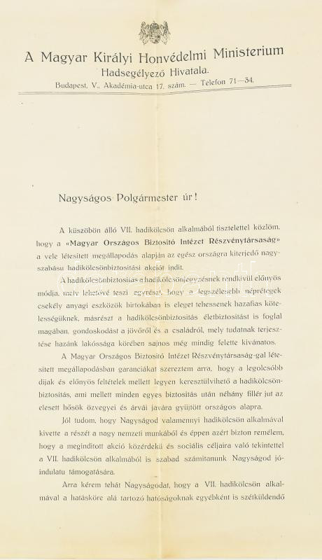 1915 Hadsegélyező hivatal hadikölcsön felhívása polgármesterek részére...