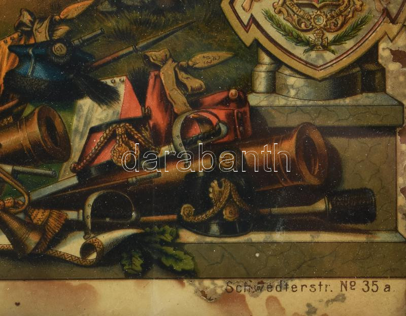 Description: cca 1900 "Szolgálati időm emlékéül", katonai emléklap, kivágott katona portré fotóval. Erősen sérült, foltos. Üvegezett fakeretben, üveg sérült. 47×36 cm