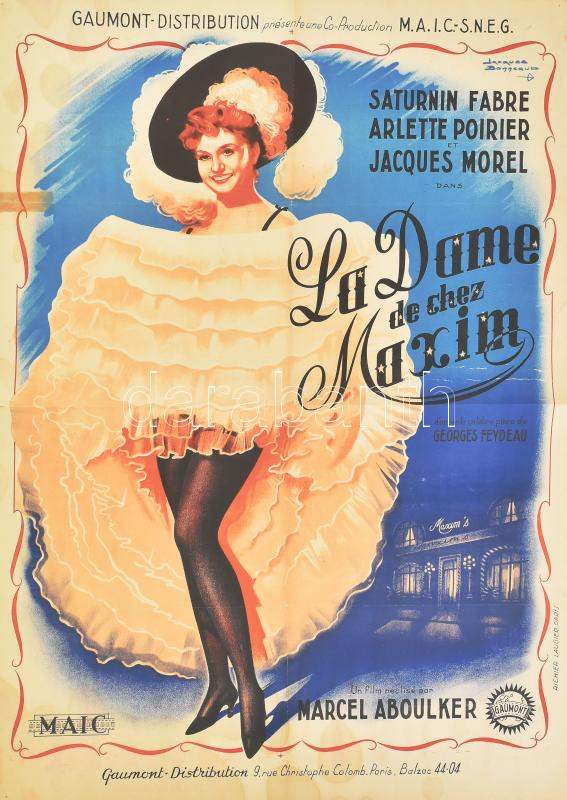 https://www.darabanth.com/en/460-Online-auction/460.0/Art-and-other-collectibles/Posters~1000003/1950-La-Dame-de-chez-Maxim-cimu-film-plakatja-hajtott-szakadassal-80x60-cm~II3086726