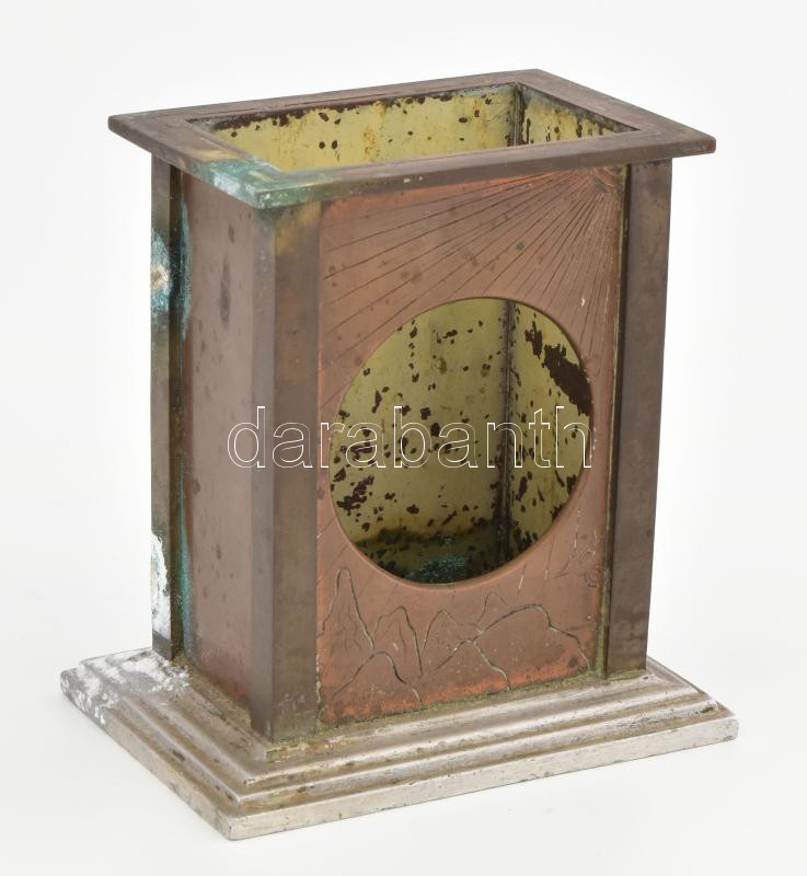 Antik asztali óra ház, réz, fém, patinával, kopott, 10x7x11 cm