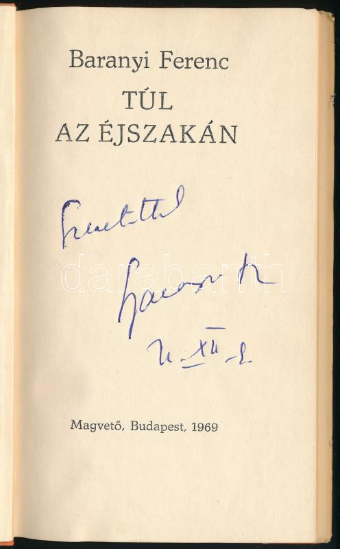 Baranyi Ferenc: Túl az éjszakán. (DEDIKÁLT). Bp., 1969, Magvető. Első ... https://www.darabanth.com/en/460-Online-auction/460.0/Books/Books-Other-rarities~1000005/Baranyi-Ferenc-Tul-az-ejszakan-DEDIKALT-Bp-1969-Magveto-Elso-kiadas-Kiadoi~II3082838