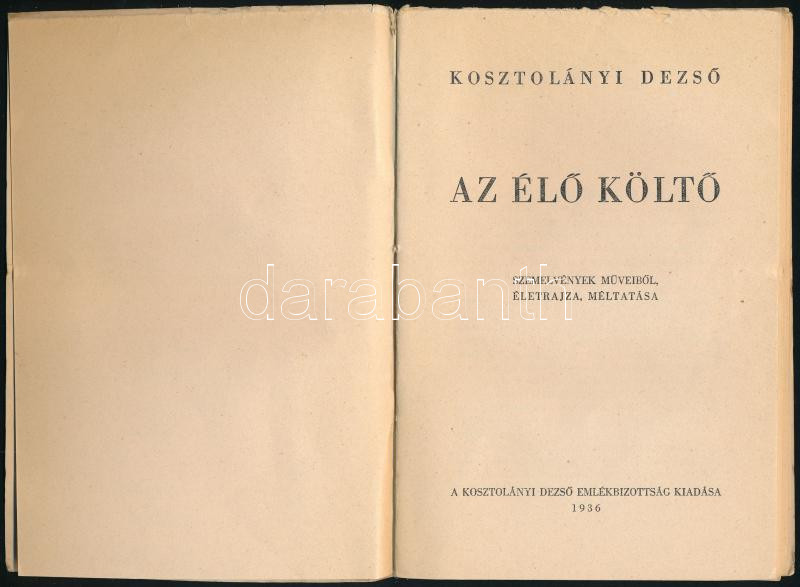 Kosztolányi Dezső: Az élő költő. Szemelvények műveiből, életrajza, mél... https://www.darabanth.com/en/460-Online-auction/460.0/Books/Books-Other-rarities~1000005/Kosztolanyi-Dezso-Az-elo-kolto-Szemelvenyek-muveibol-eletrajza-meltatasa-Bp-1936-~II3084415