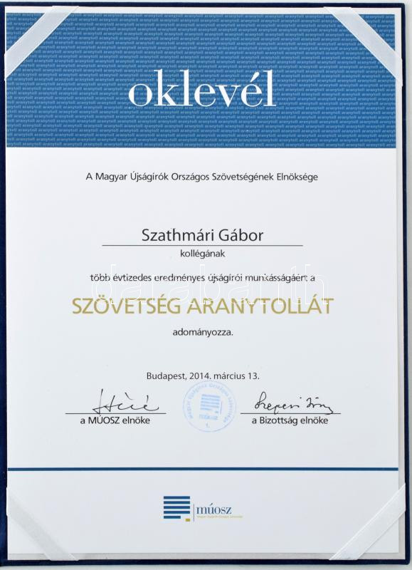 ~2014. "A Magyar Újságírók Szövetségének aranytolla" aranyoz...