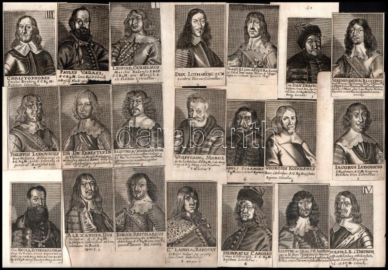 Description: Matthias Van Sommer: XVII. századi magyar és külföldi főurak portréi. (26 db). Nürnberg. 1663. 26 db rézmetszetű porté: Rákóczi László, Vadasi Pál, Draskovich János, Esterházy Miklós, stb. ismertető feliratokkal Egyenként kivágva, kivéve egy nagyobb összefüggést. Egyenként kb 5,5x9 cm