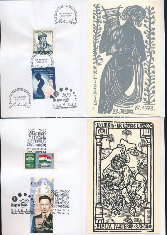 6 db halmozott grafika: ex libris, bélyeg, alkalmi bélyegzés azonos té...