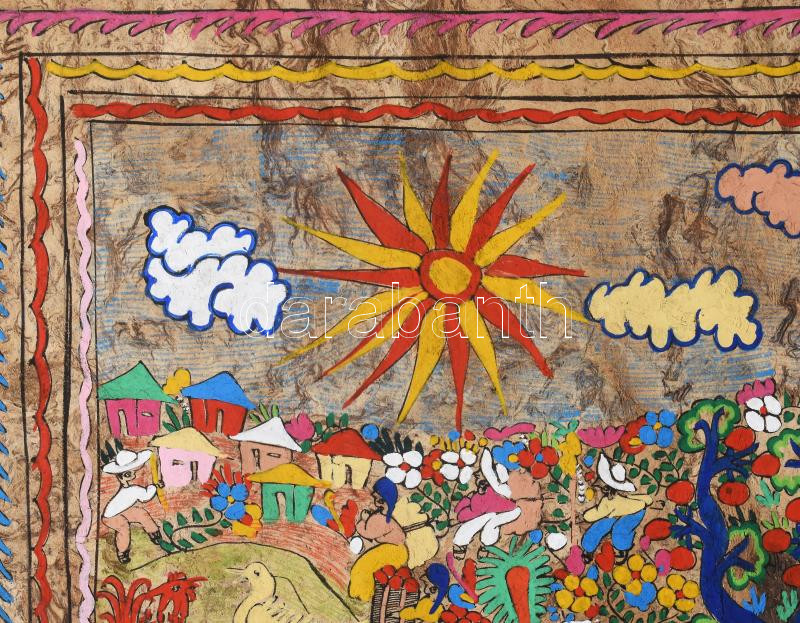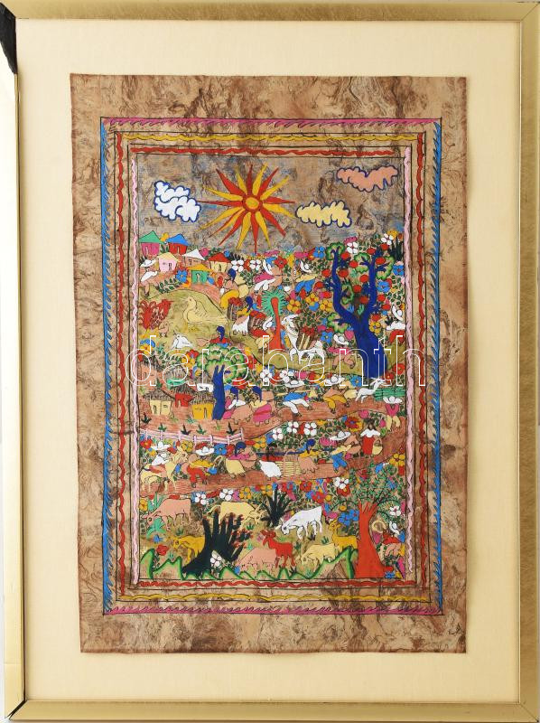 Jelzés nélkül, távol-keleti alkotó, XX. sz. második fele: Körforgás. Vegyes technika, parafa. Dekoratív, sérült fakeretben. 49×33,5 cm