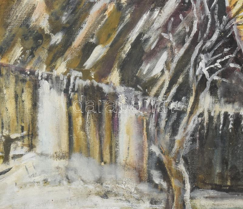 Nagy István jelzéssel: Udvar. Olaj, vászon. Üvegezett fakeretben, keret hátoldalán üvegen ragasztószalaggal javított repedéssel. 45×58 cm