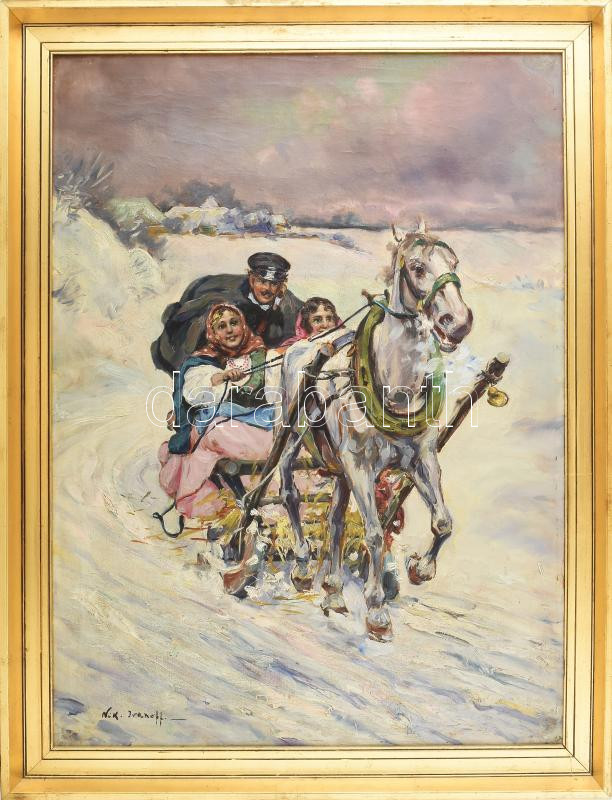 Nik Ivanoff jelzéssel: Téli kirándulás. Olaj, vászon. Dekoratív fakere...