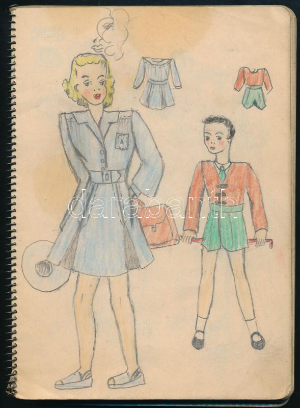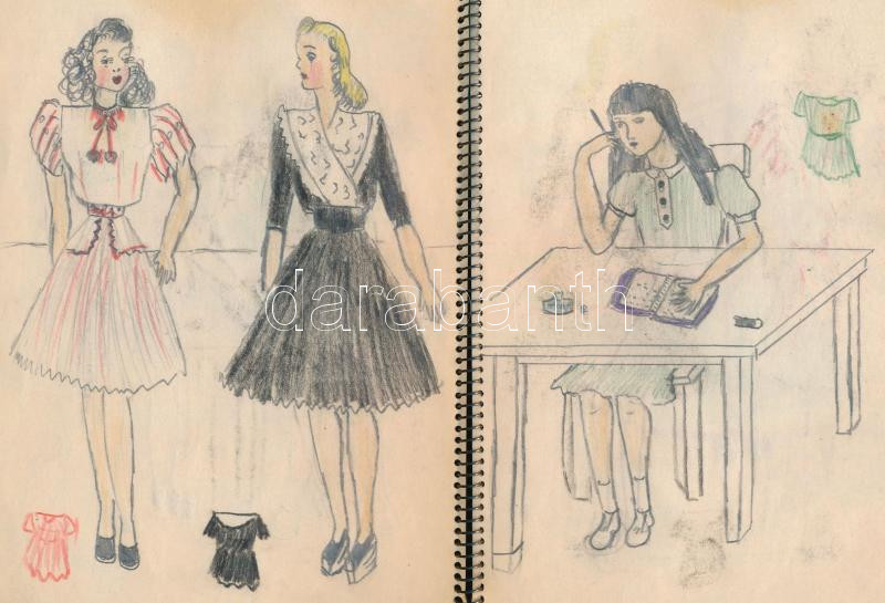 Rotter Ágnes (?- ): "Divatlap", összesen kb. 40-50 db grafika és vázlat füzetben, 1940 körül. Ceruza, papír, részben jelzett, lapméret: 17,5x12 cm