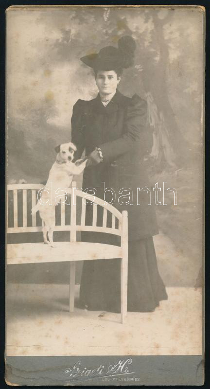 cca 1905 Nő kutyával, keményhátú fotó Szigeti Henrik szolnoki műterméb...
